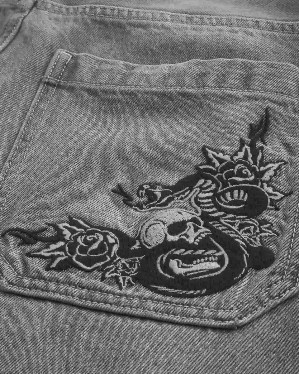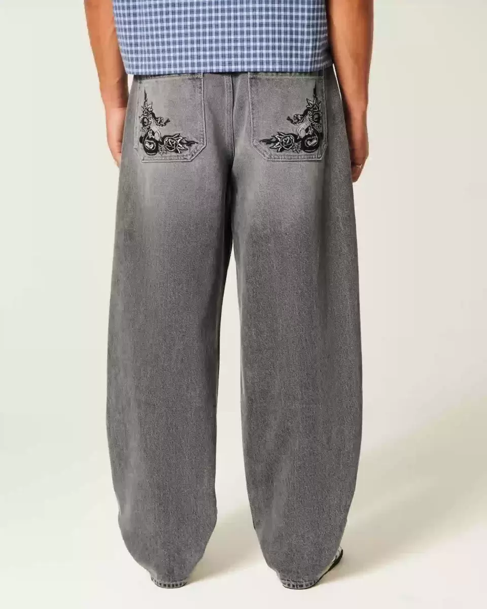 Wygodne jeansy typu skater z luźną nogawką. Wyblakły, haftowany nadruk na tylnej kieszeni. Produkt importowany.