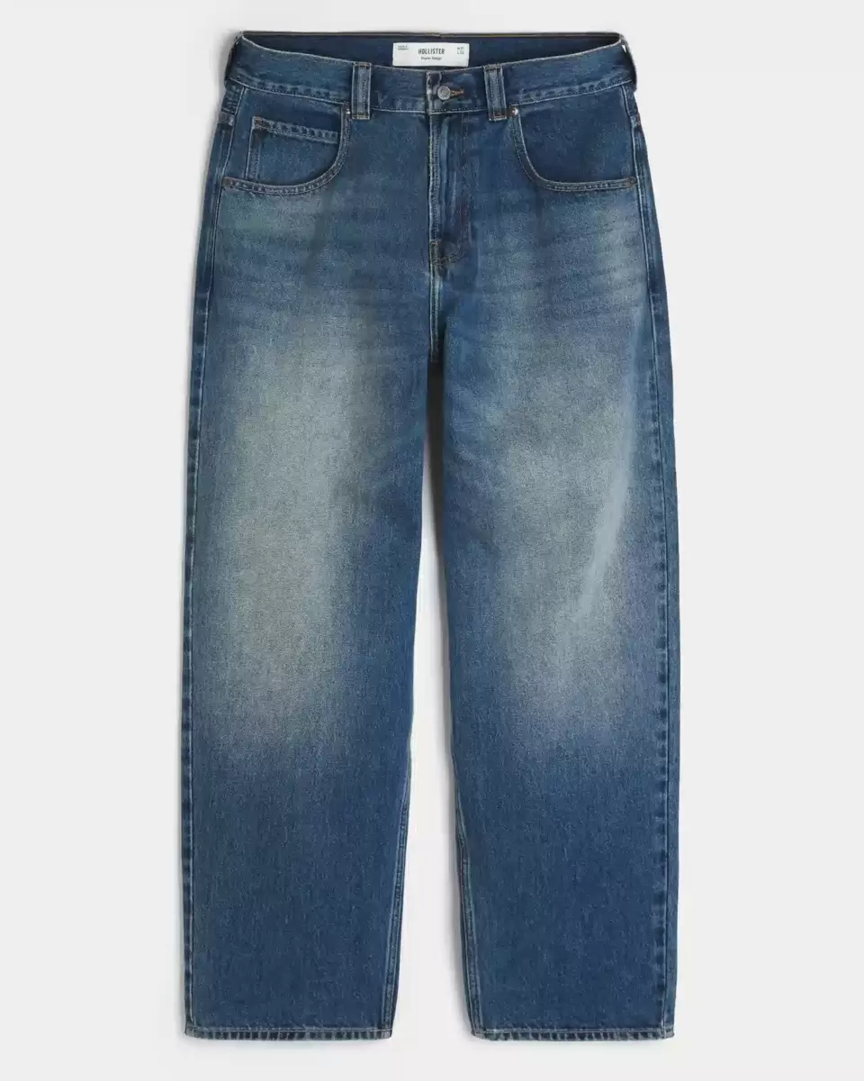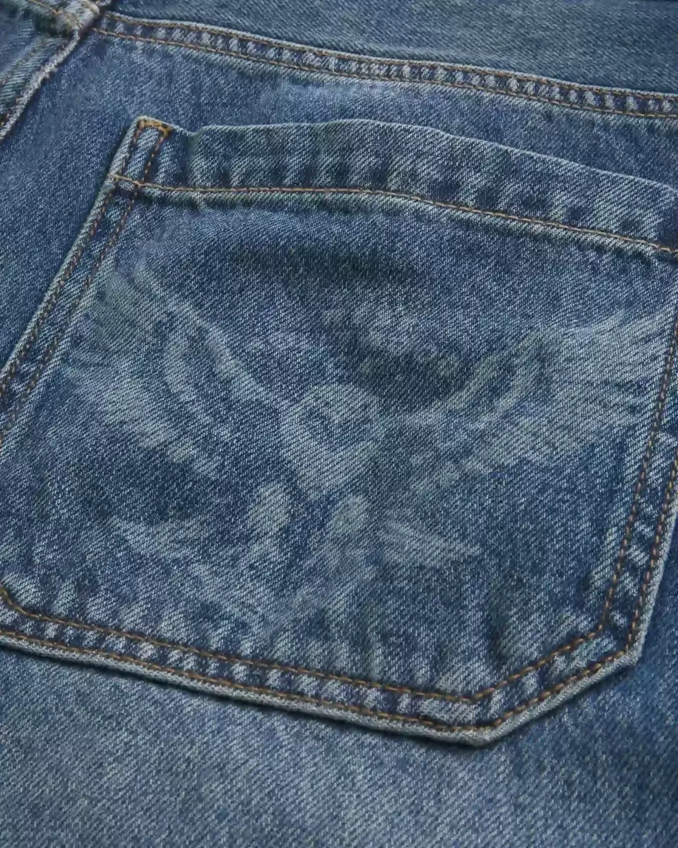 Wygodne jeansy typu skater z luźnymi nogawkami. Średnio sprane, z przetarciami i wąsami, z grafiką orła na tylnej kieszeni. Importowane.