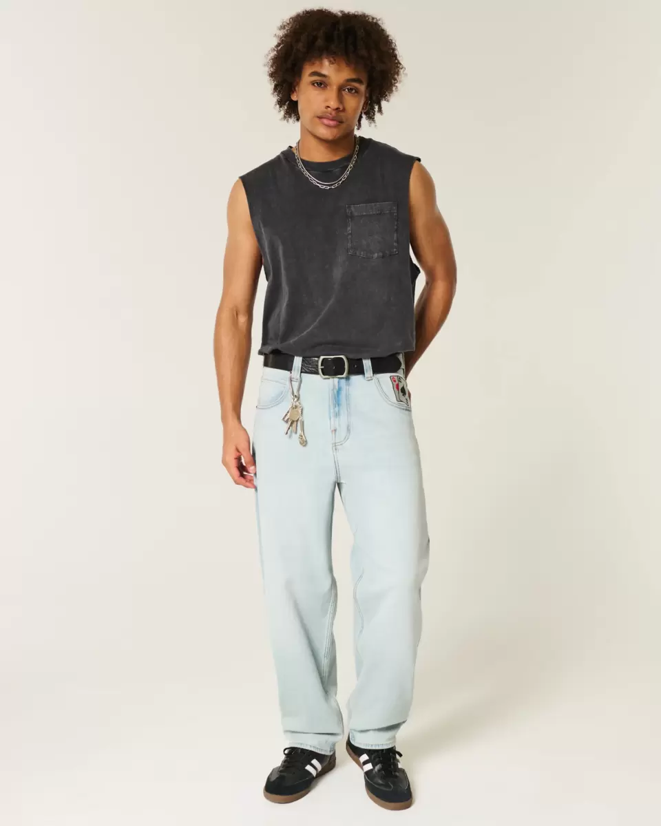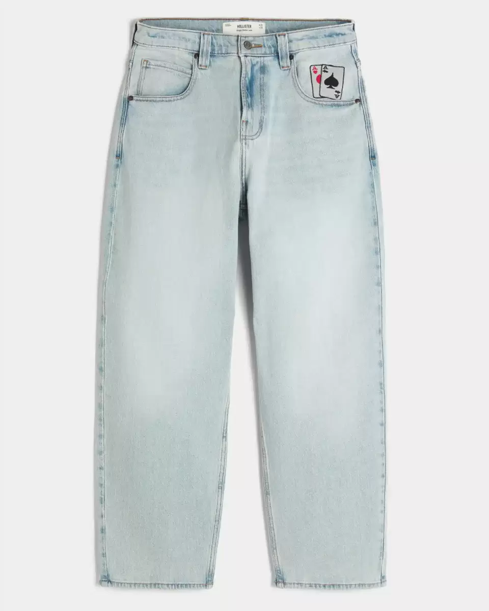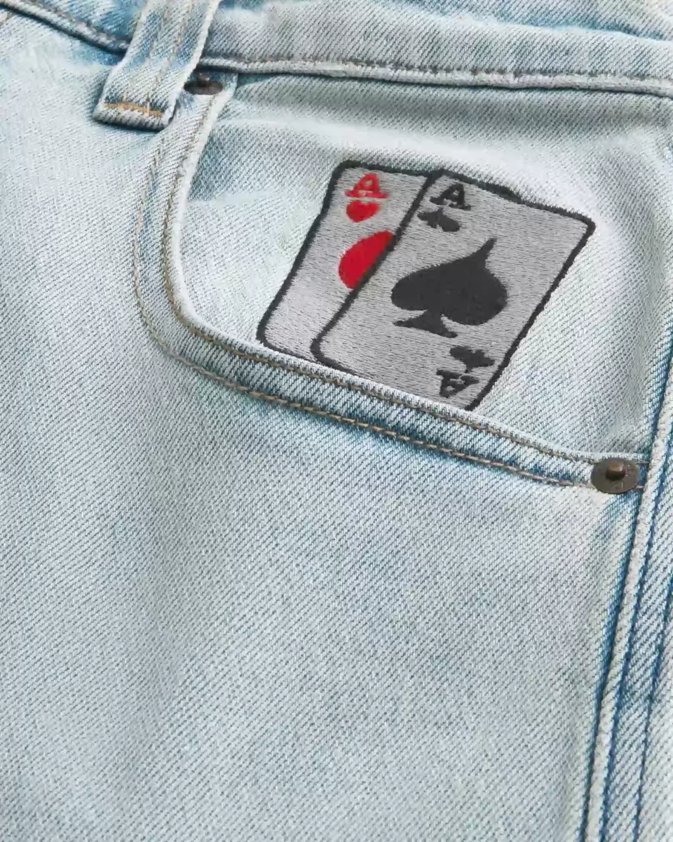 Wygodne jeansy w stylu skateboardowym, w jasnym odcieniu, z luźną nogawką. Haftowana grafika z kartami do gry na lewej kieszeni, wyblakłe, z wąsami. Importowane.