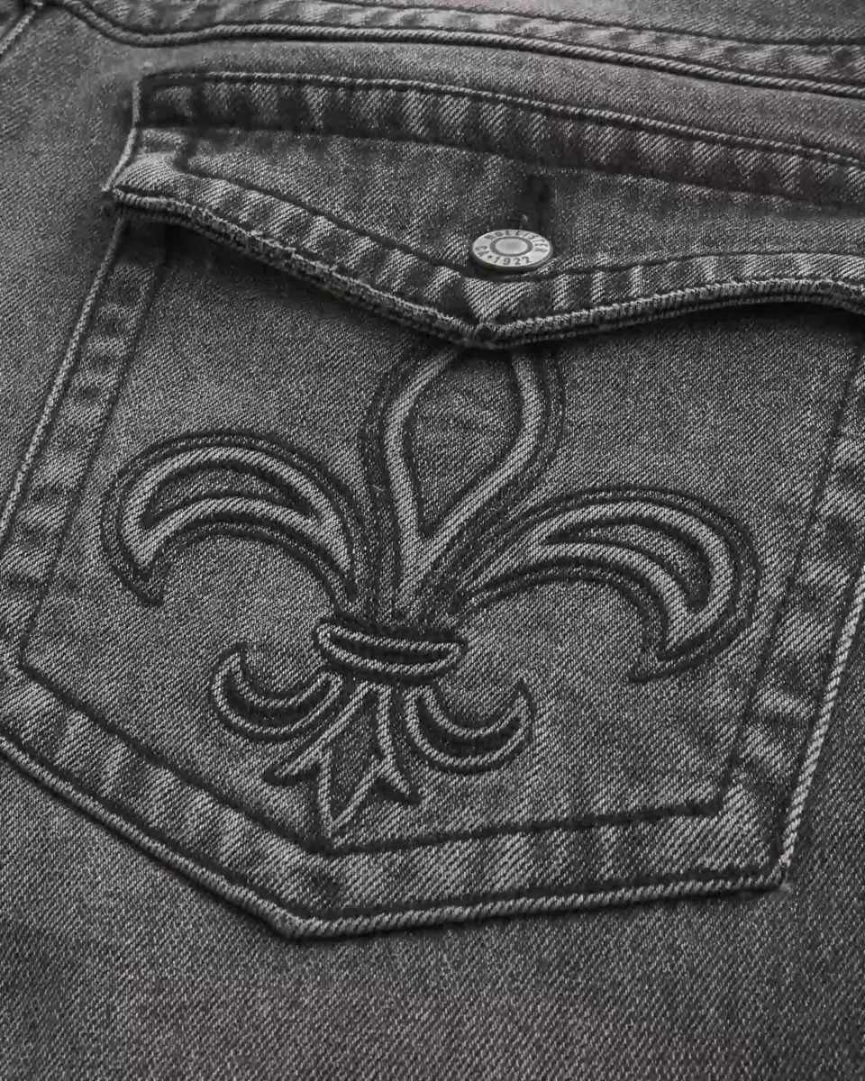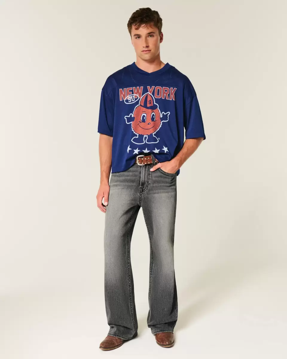 Wygodne jeansy z luźną nogawką i rozcięciem typu bootcut. Wyblakła czerń z przetarciami i przetarciami, kultowy krój z 5 kieszeniami, haftowana grafika na tylnej kieszeni, tylne kieszenie z patkami. Importowane.
