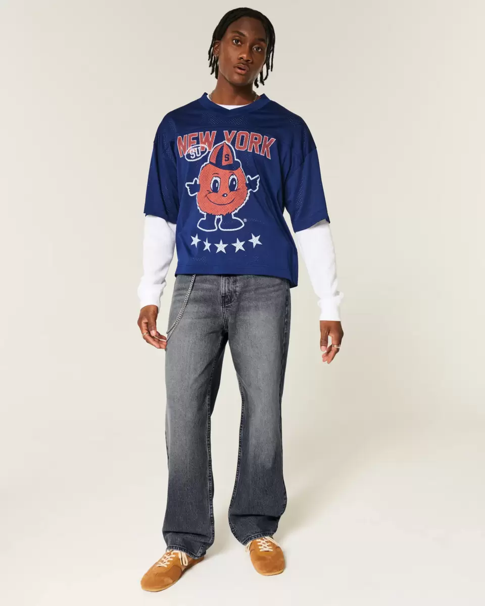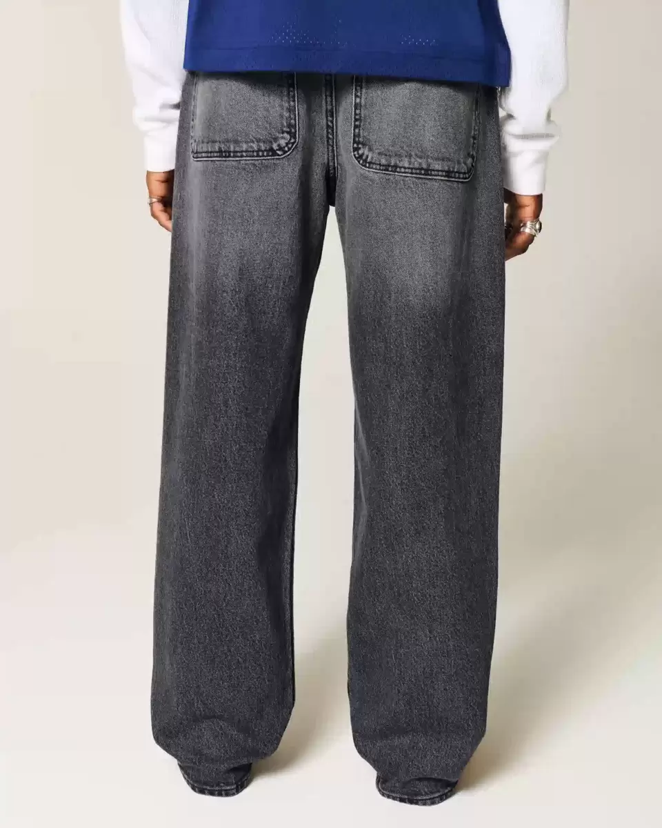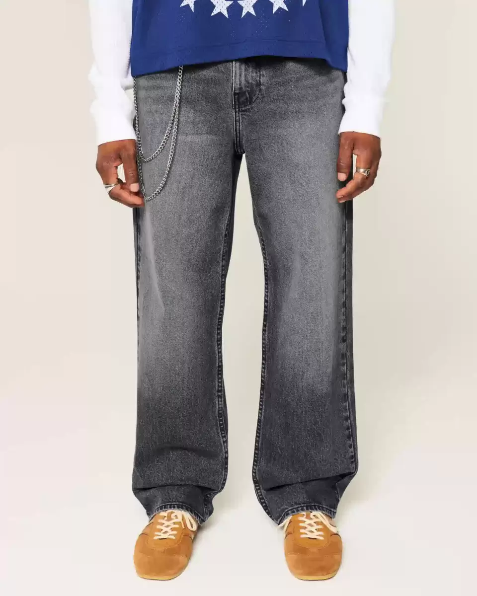 Wygodne jeansy w spranej czerni, z luźną nogawką. Wyblakłe, postrzępione wzory, kultowy fason z pięcioma kieszeniami. Importowane.