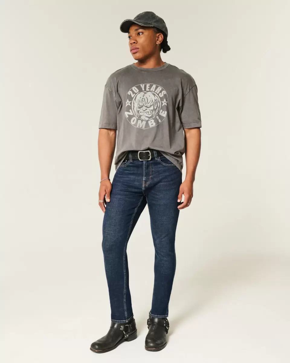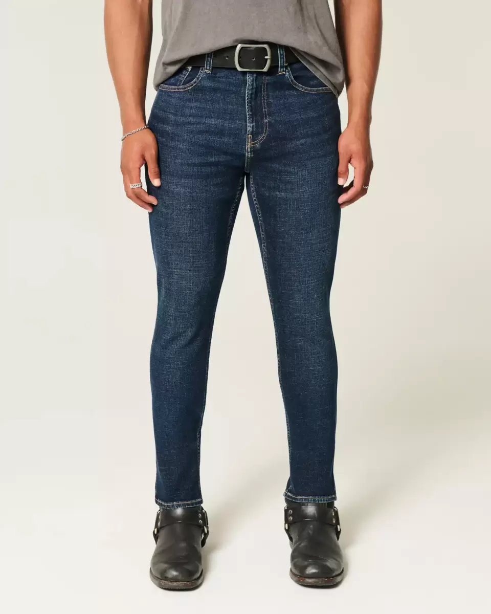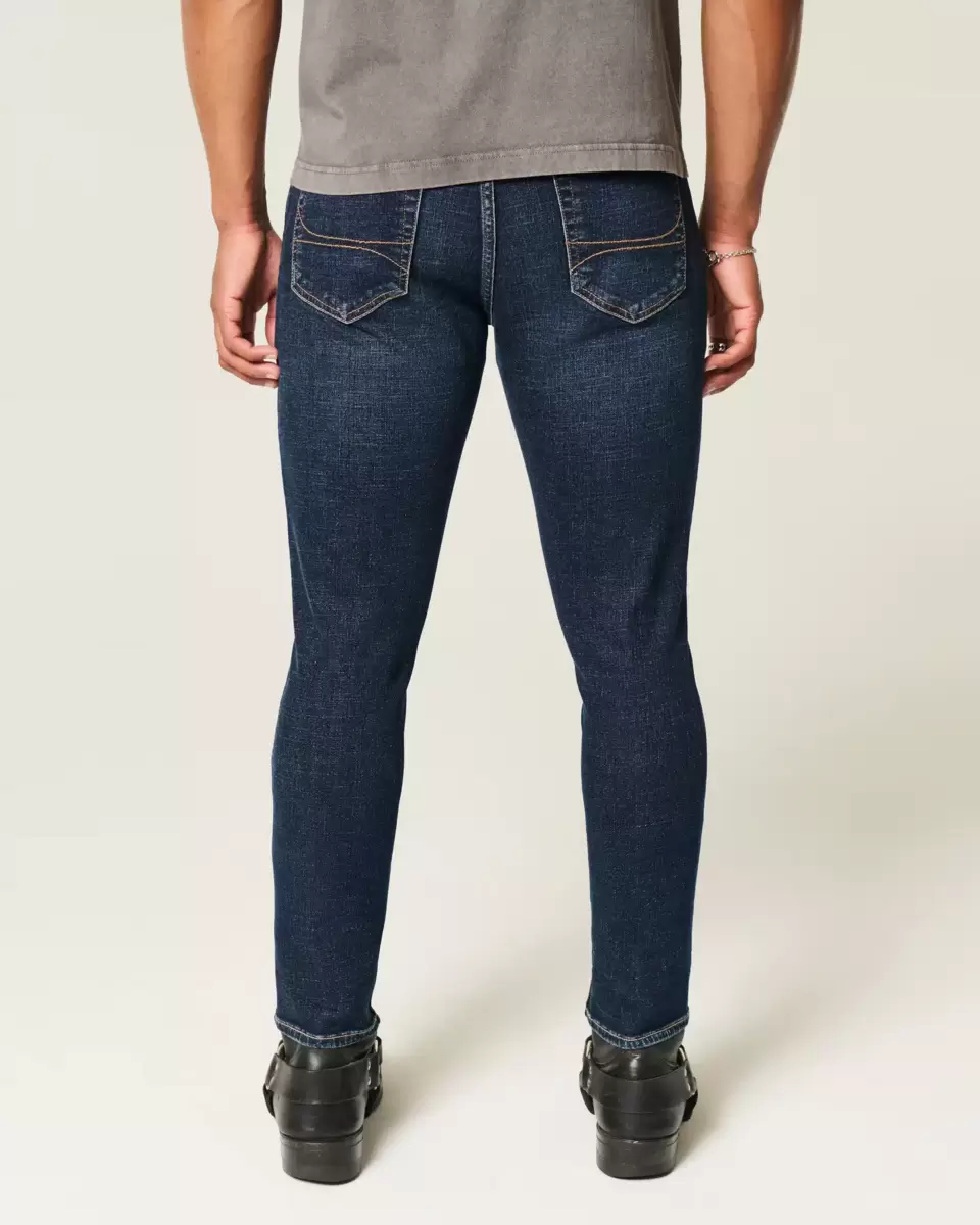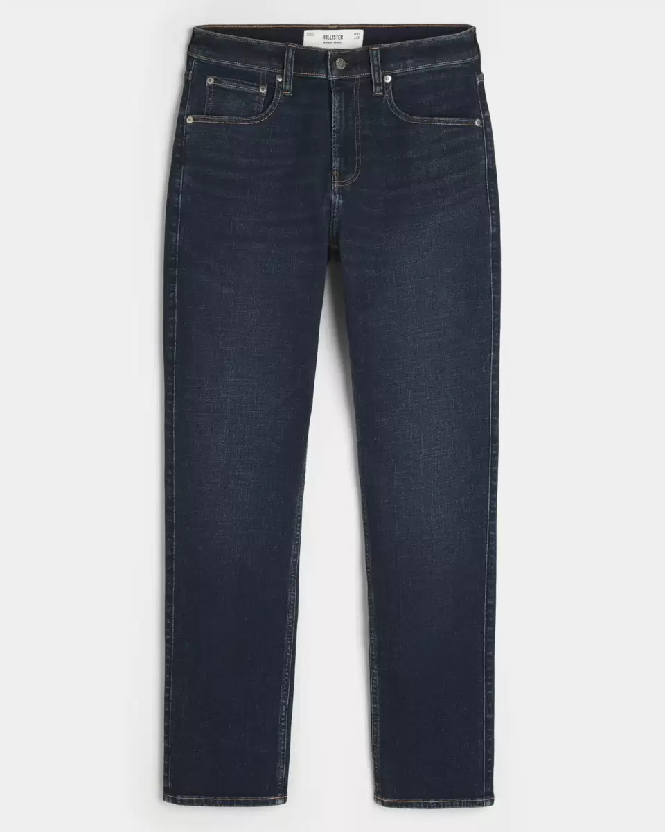 Dżinsy w ciemnym odcieniu, dopasowane, z większym luzem w udach. Wyblaknięcia i przetarcia. Importowane.
