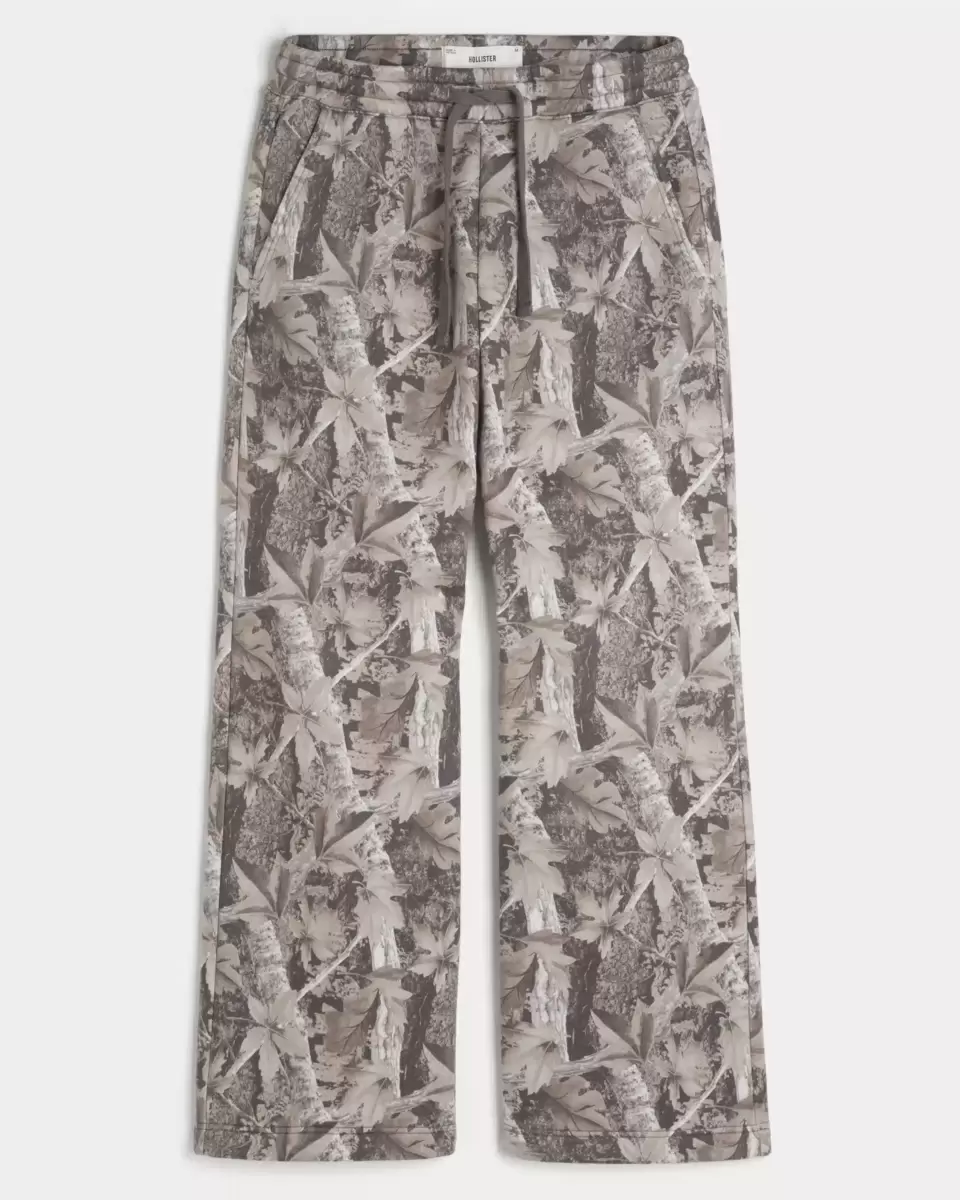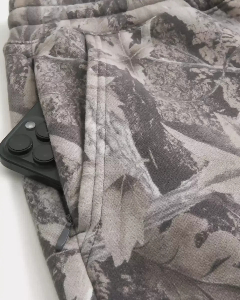 Supermiękkie, polarowe spodnie dresowe z nogawkami typu bootcut. Kieszenie, prawa kieszeń na zamek, ściągacz w pasie, wzór kamuflażowy na całej powierzchni. Importowane.