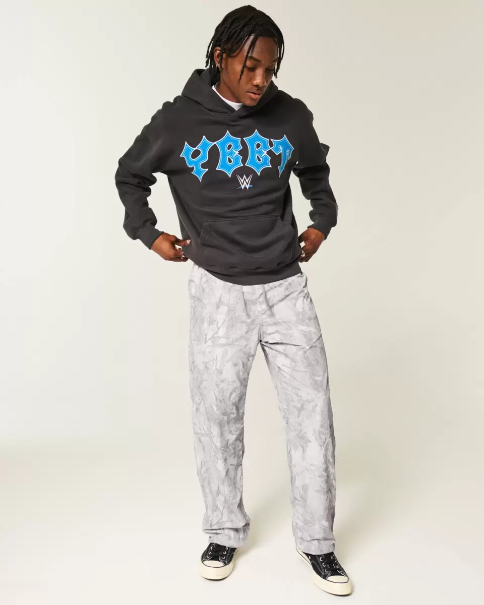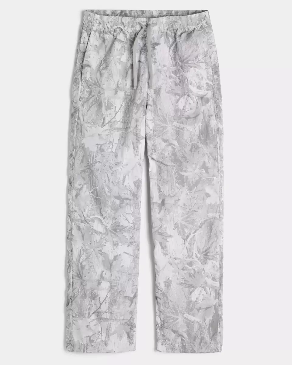 Wygodne, klasyczne spodnie dresowe z luźnymi nogawkami i ściągaczem w pasie. Wzór kamuflażowy na całej powierzchni. Produkt importowany.