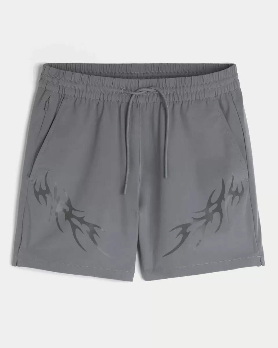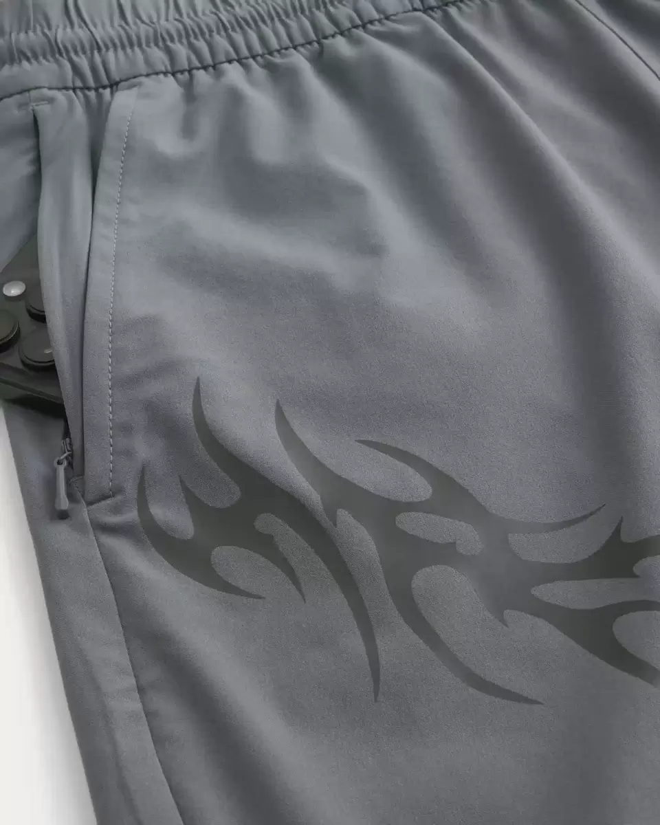 Wygodne, sportowe spodenki z elastanem, długości do połowy uda, ze ściągaczem w pasie. Grafika, prawa kieszeń na zamek błyskawiczny, kieszenie. Produkt importowany.